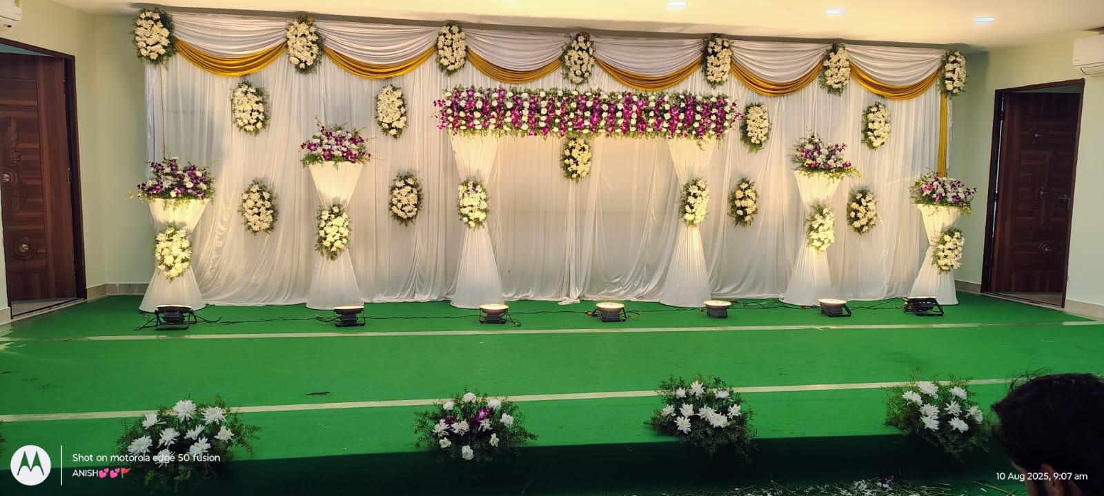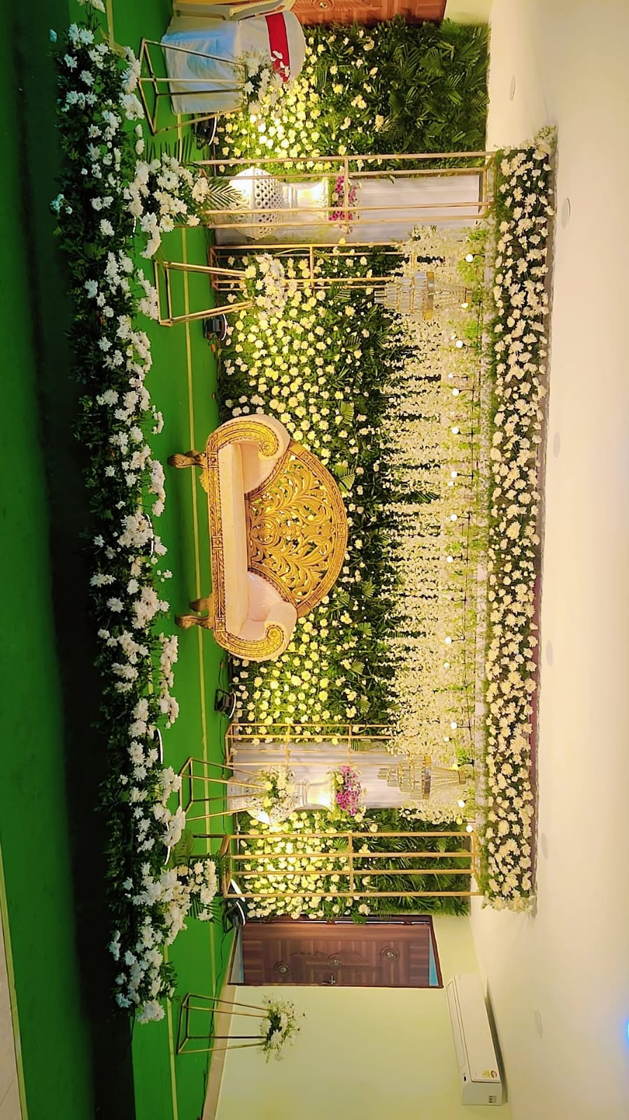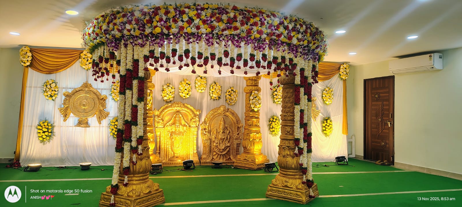 Traditional marigold and jasmine strands draped over a bespoke mandap frame, richly layered with silk and golden motifs.